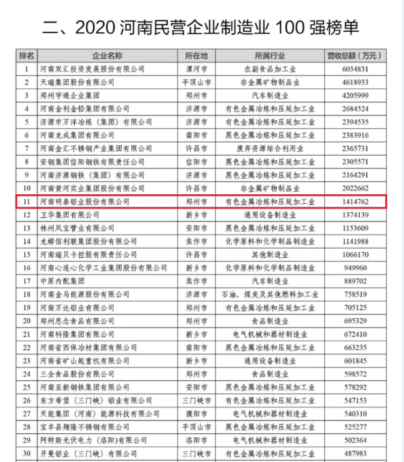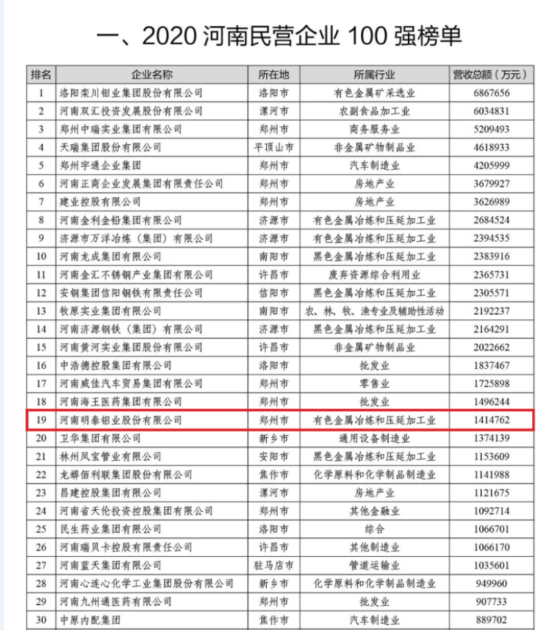 發布會上,明泰鋁業憑借141.4億的營業總額再次入選2020河南民營企業100強榜單和2020河南民營企業制造業100強榜單,分別位列第19位、第11位。近年來,明泰鋁業不斷深化產業結構與升級,主動履行社會責任,加快企業邁向高質量發展的步伐。又一次榮登雙百強榜單,是社會各界對明泰鋁業近年來快速發展的肯定,也標志著明泰鋁業在全省民營企業中的重要作用和地位。