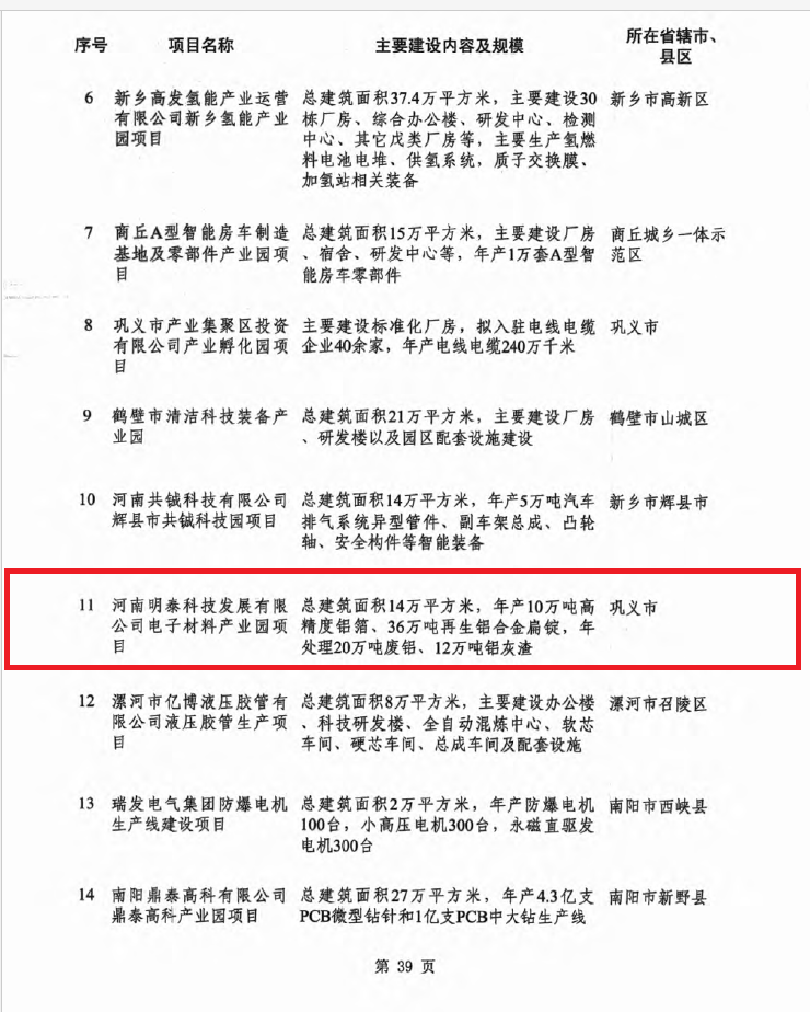 近日,河南省發改委發布2021年河南省重點建設項目名單,名單共列項目1371個,總投資4.4萬億元,年度計劃完成投資1.1萬億元,涵蓋新型基礎設施、新型城鎮化、重大基礎設施、產業結構優化升級、創新驅動、生態環保、社會民生七大領域。其中,明泰科技電子材料產業園項目榜上有名。